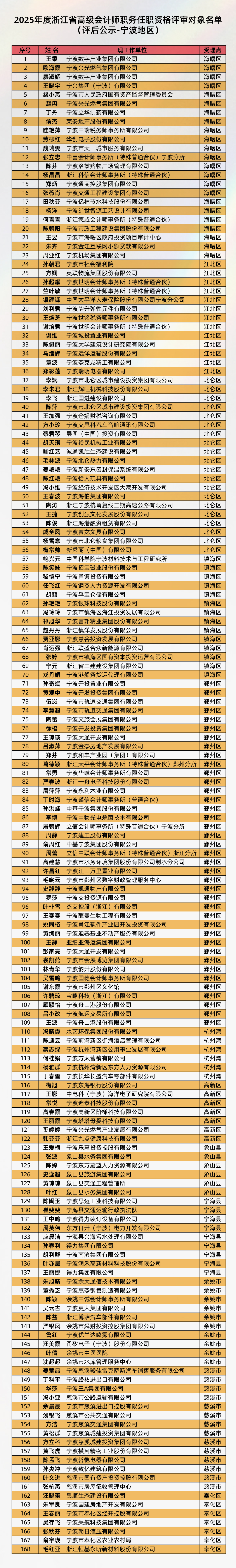 邮编:310006附件:2025年度浙江省高级会计师职务任职资格评审对象花名册(宁波地区)